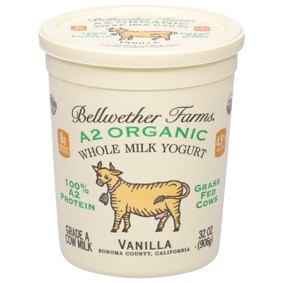 PRODUCT DETAILS: 8 g protein per serving. 100% A2 protein. USDA Organic. Certified organic by organic certifiers. 4.5% milkfat Grass fed cows. We are a family owned creamery located in western Sonoma County, California. Since 1990 we have been producing award-winning whole milk dairy products. Our a2 organic, full-fat yogurt is made with milk from healthy, grass-fed jersey cows-the creamiest, most delicious cow milk available. These cows naturally produce milk containing only a2 protein which is easier for many people to digest. We hope you enjoy this refreshing, naturally creamier yogurt. For the nutritional benefits of whole milk, please visit www.bellwetherfarms.com. Grade A. www.bellwetherfarms.com. Join us online at www.bellwetherfarms.com or find us at Instagram. Facebook. Bellwether Farms Foundation: 1% of our sales is pledged to strengthen the food system by supporting organizations which provide hunger relief or food-related education to our communities. Sonoma country, California.